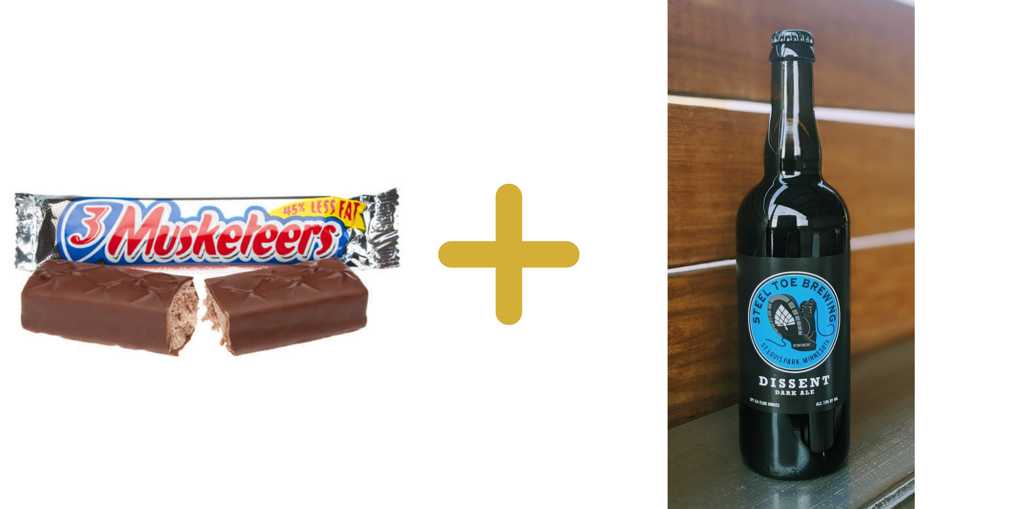 To spice up Snickers’ fuddy-duddy cousin, we’re pairing it with the bracing and malty Dissent from Steel Toe Brewing. Dissent’s cascade of bitter dark chocolate and coffee flavors adds some much-needed excitement to the 3 Musketeers, and the bar’s whipped creaminess pairs well with the smooth body Dissent gains from the oats used in its brewing.