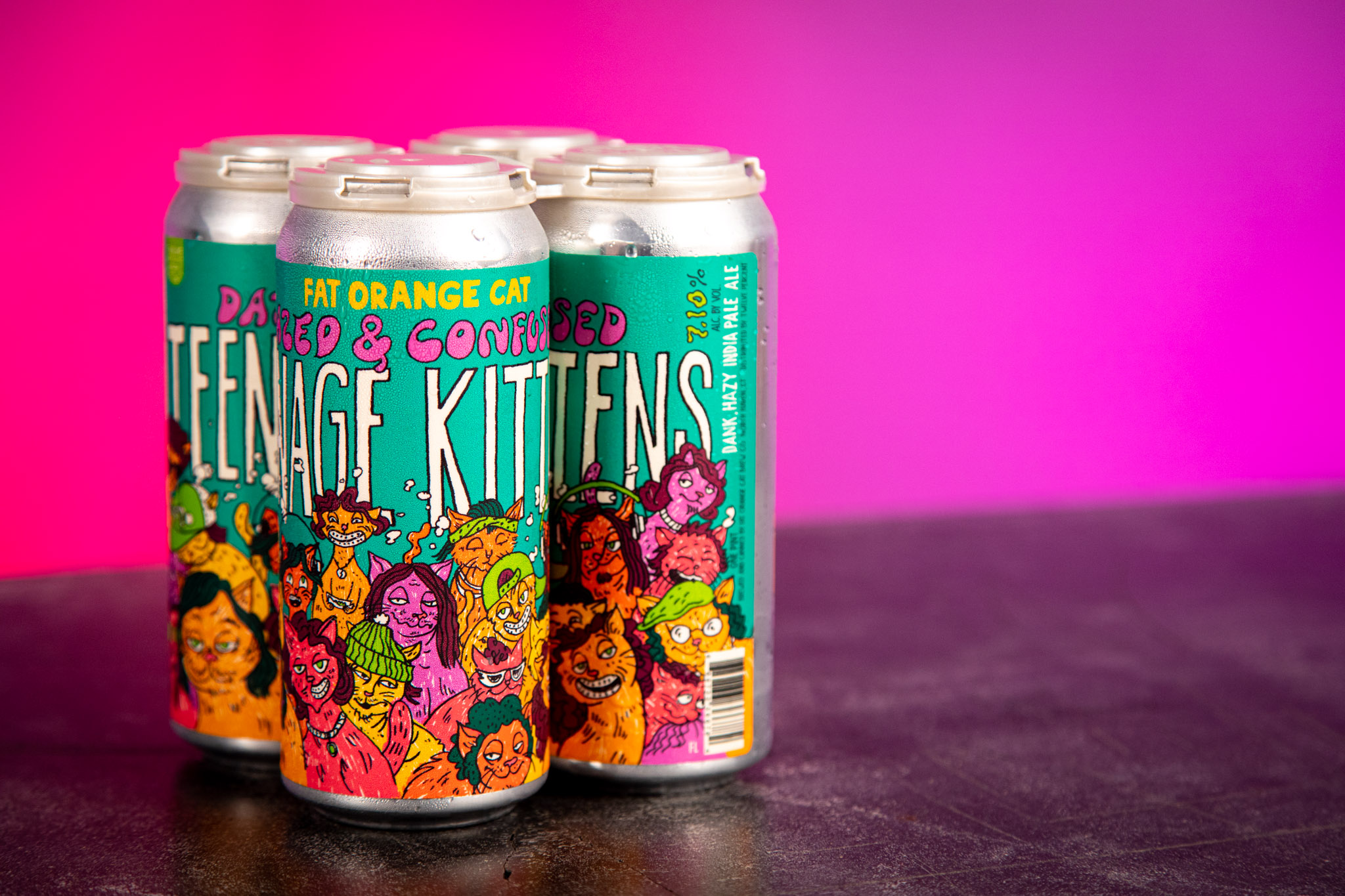 Fat Orange Cat Dazed And Confused Teenage Kittens Hazy IPA 4pk 16oz – A slightly amped-up version of Baby Kittens, clocking in at 7.10% and aggressively hopped and dank. 7.1% ABV