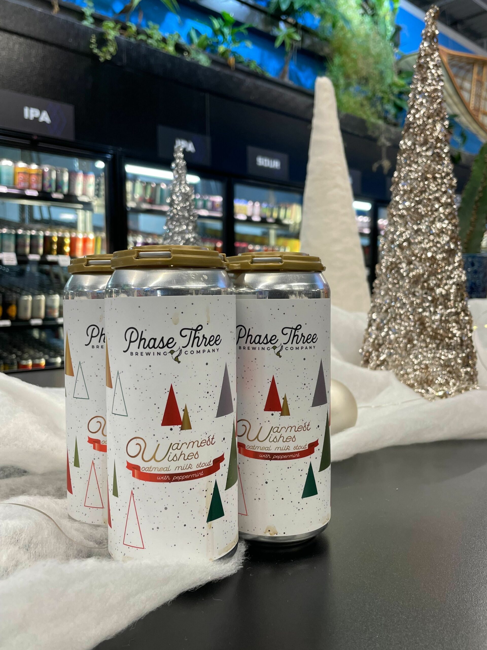 Phase Three Warmest Wishes Oatmeal Stout 4pk 16oz – Phase Three Brewing created a delicious winter-inspired stout that’s brewed with milk sugar and oats leaving you with that warm cozy feeling! 7.3% ABV