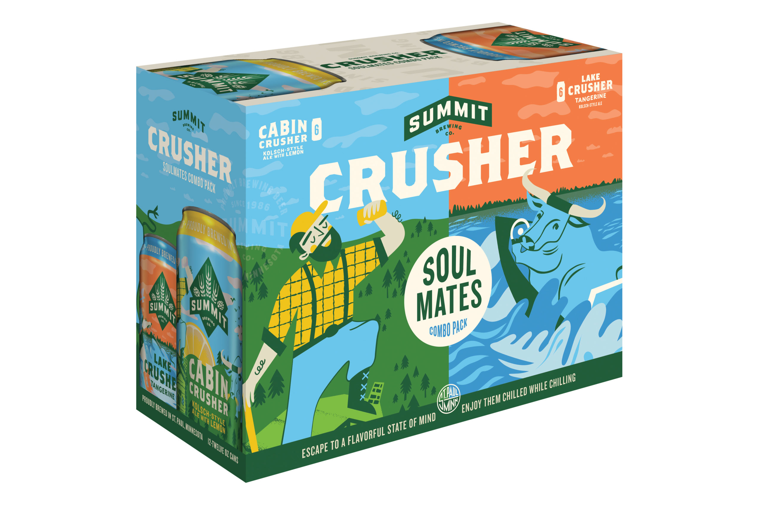 - Lake Crusher Tangerine – A new entry into the Crusher Kölsch-style lineup, this fruited variety is sold in the new Crusher Soulmates combo pack. “Sweet orange flavors meld with the zesty, citrus Lemon Drop and Loral hops to create a tangy, juicy brew, Summit says. 4.8% ABV.