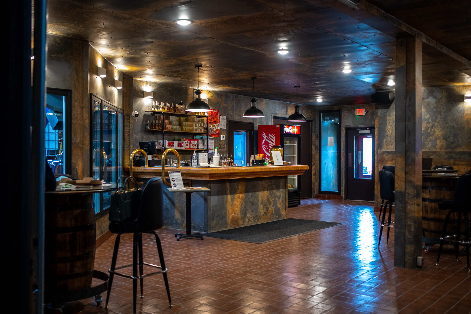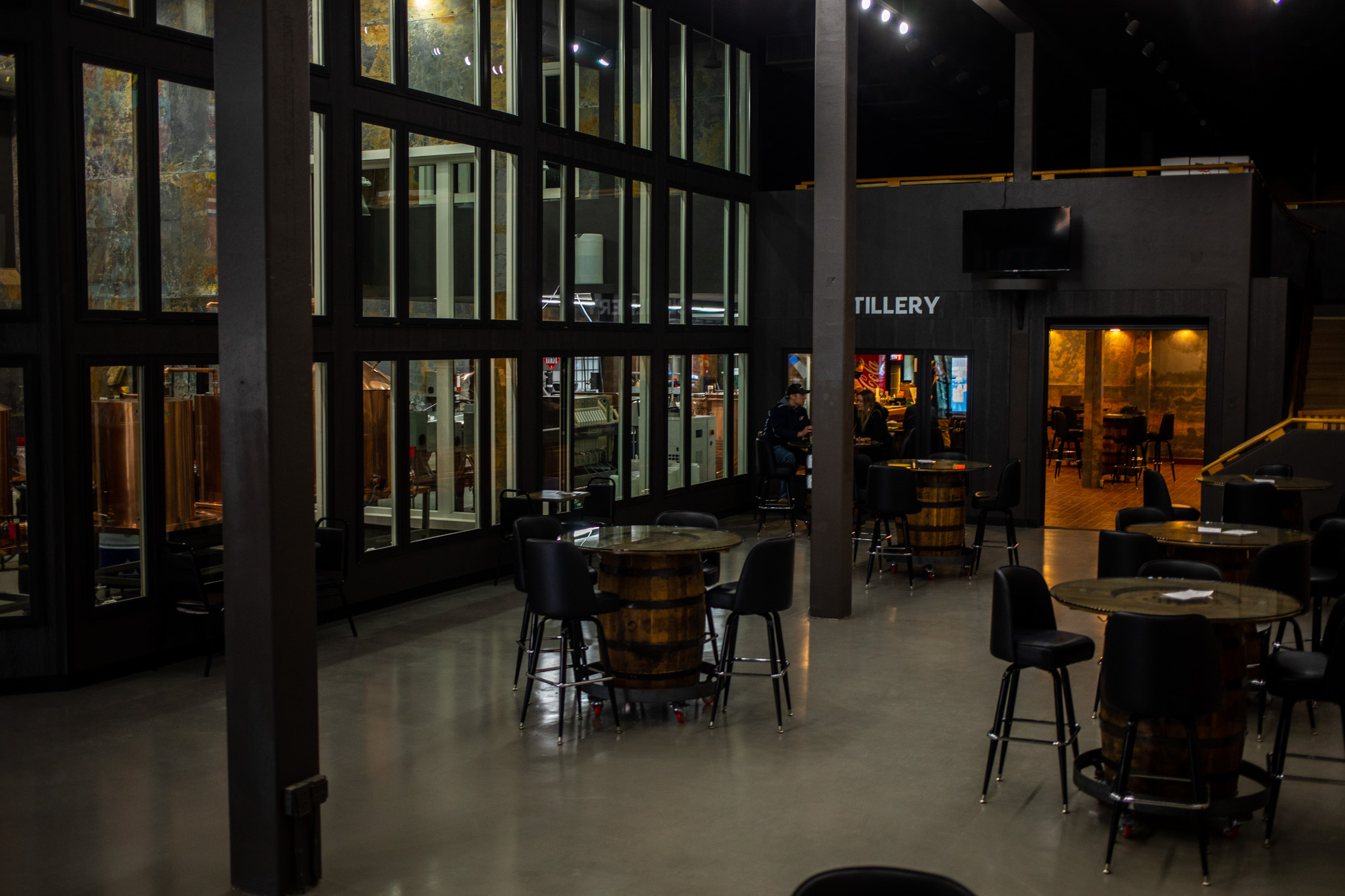 Over the course of the buildout, the main floor interior and front facade of Little Round’s building were transformed by large sheets of steel which give a unique look of weathered marbled grays and brown hues. Floor-to-ceiling windows also allow for a look at Little Round’s copper stills and production facility.