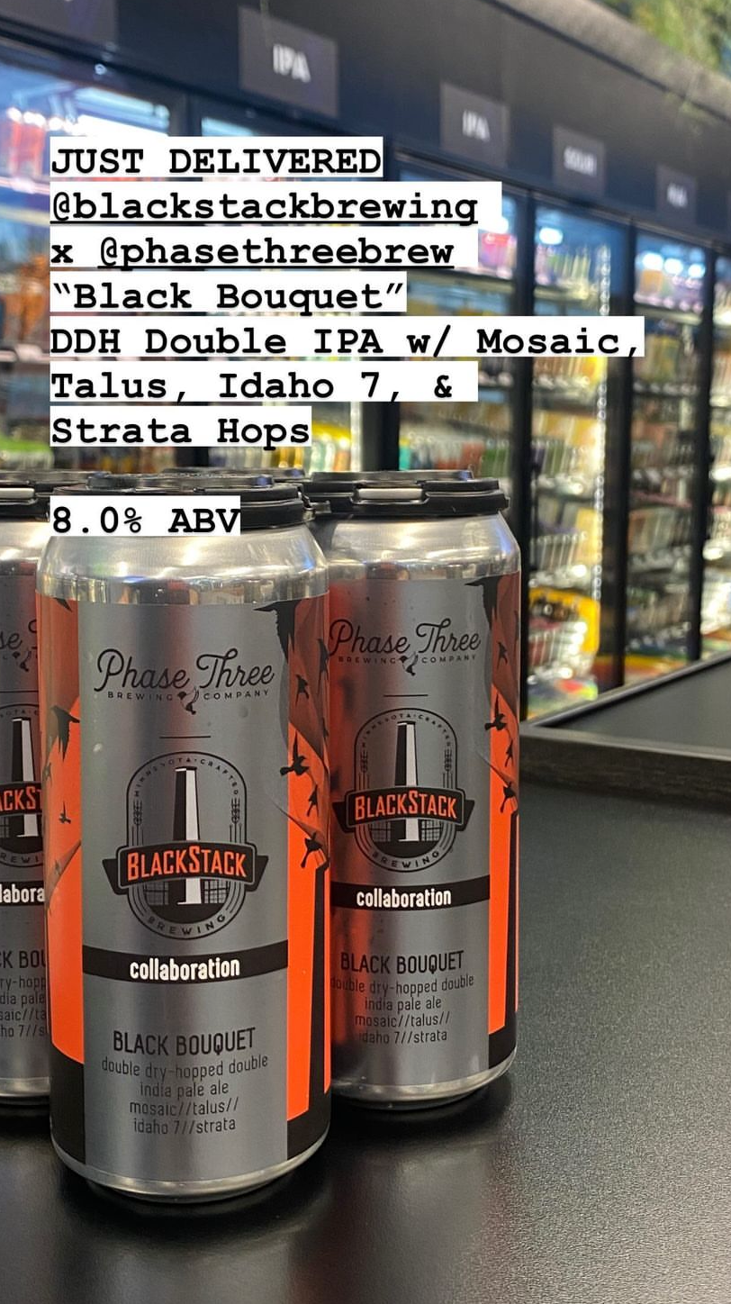 Phase Three Collab Black Bouquet DDH DIPA 4pk 16oz – Double dry-hopped double IPA with Mosaic, Talus, Idaho 7, and Strata. 8% ABV