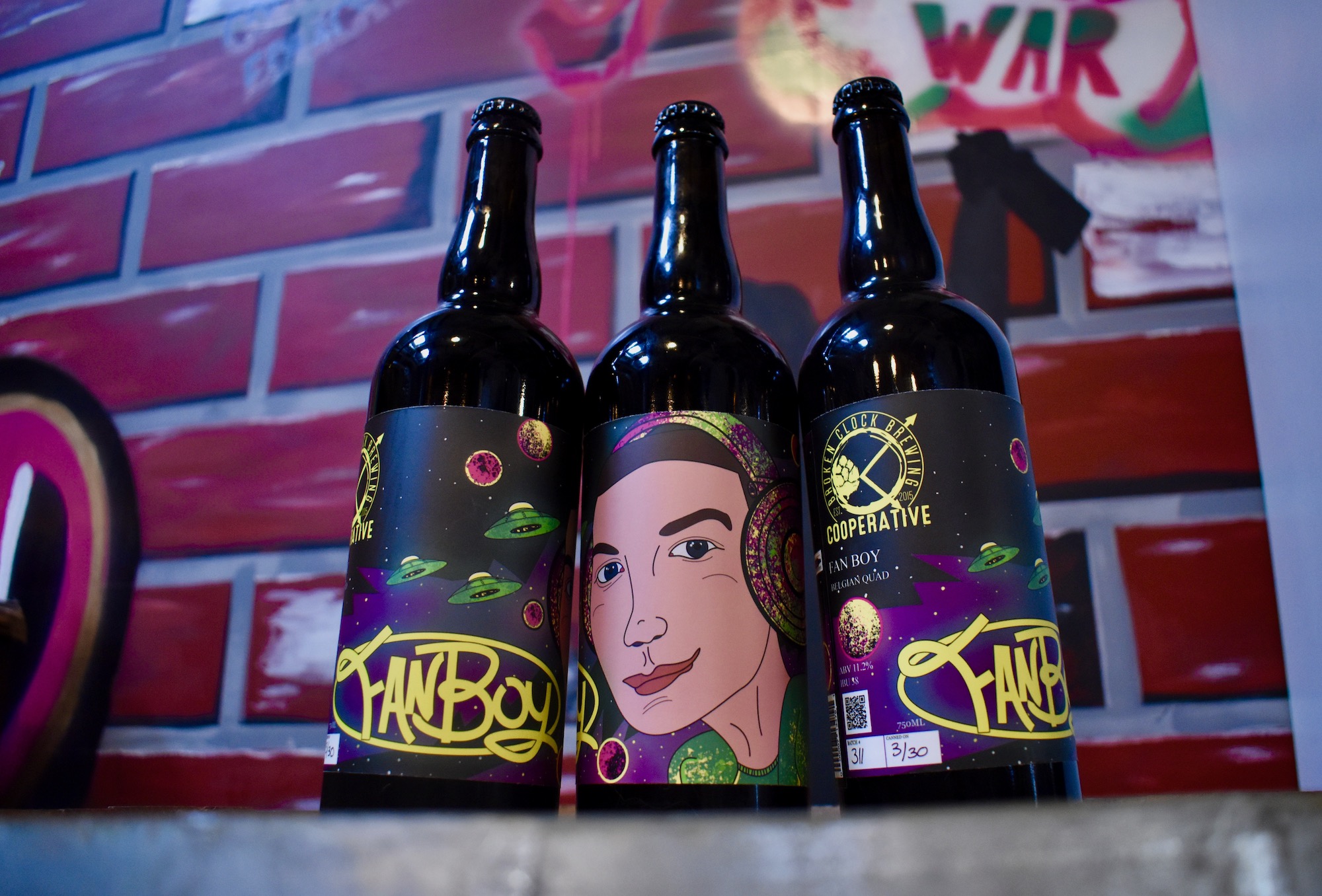 Broken Clock Brewing Cooperative Fan Boy – A Belgian-style quadruple with notes of caramel, dark sugar, raisins, dates, and figs, aged in bourbon barrels. Batch number 311 from the brewery and 11.3% ABV, 38 IBU.