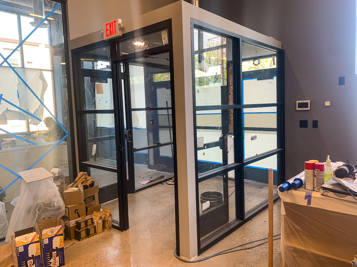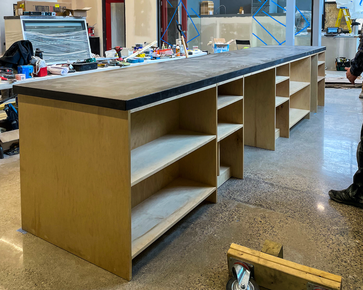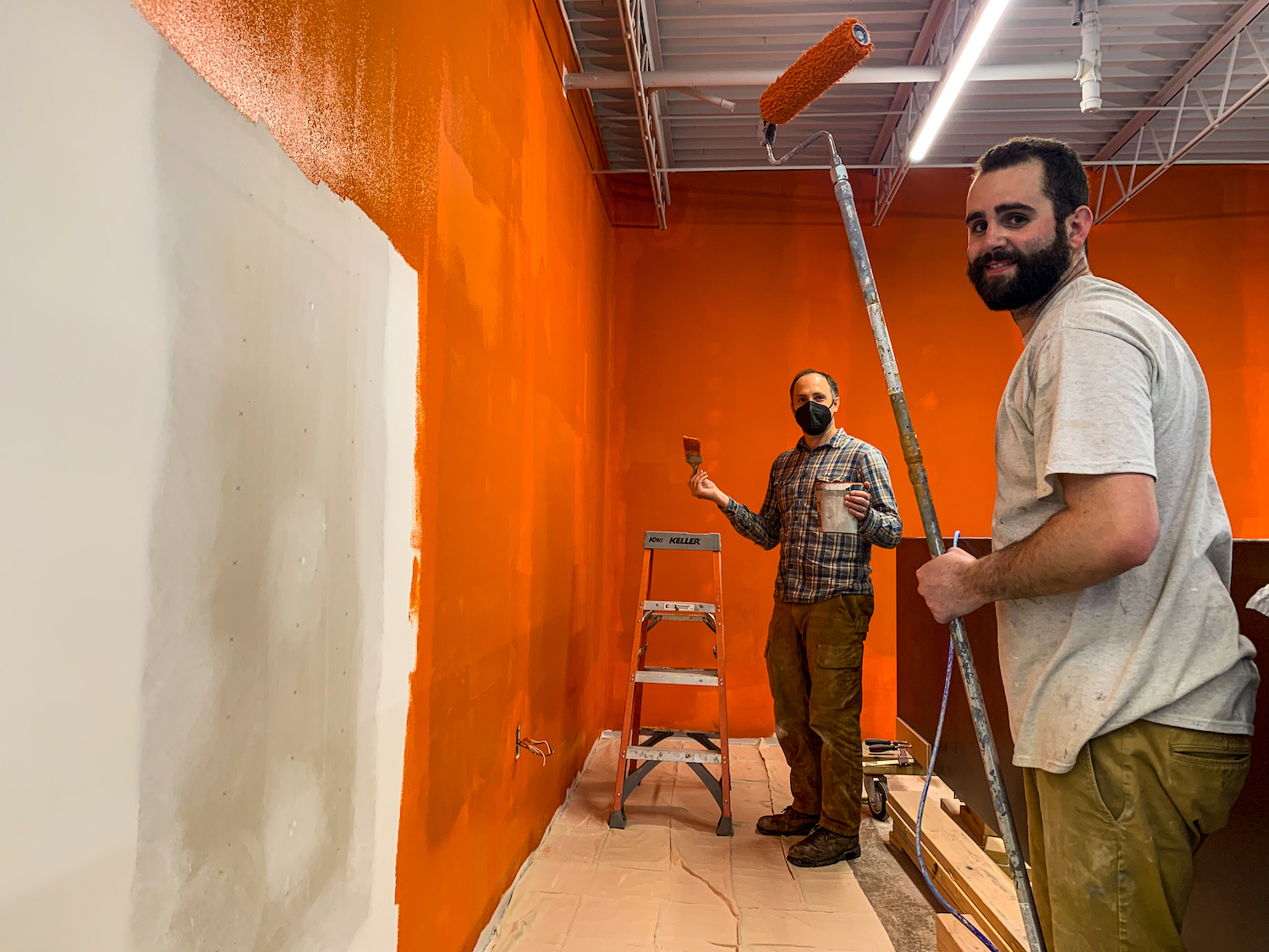 We love bold, bright colors, so we had a ton of fun painting one area of our store with eye-catching orange and electric blue shades. We’ve also done some more painting in our coffee shop space as well. Our Moss Wall has arrived and already looks awesome, we can’t wait to see how it grows! Additionally, we’ve completed work on the vestibule and glass walls that separate our main store space from our coffee shop, and set up our check-out counter. That’s one solid piece of concrete across the top, it took our whole team to lift it into place!