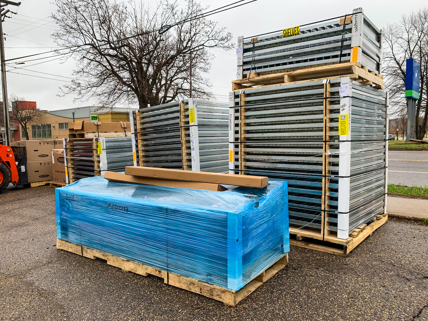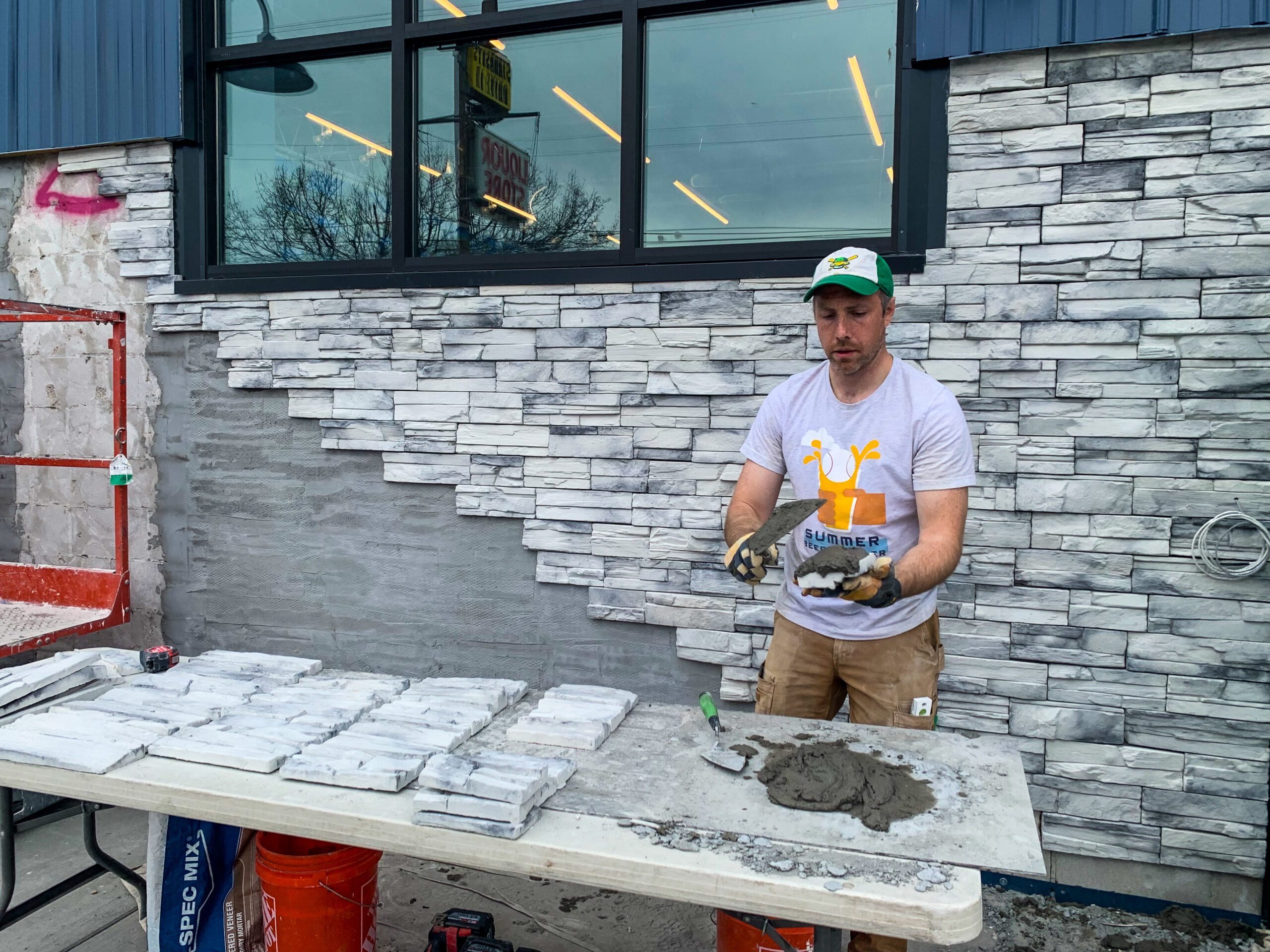 If you’ve walked or driven by our store in the past few weeks, you’ve probably seen our staff outside, hard at work on making some much-needed updates to our building’s exterior. We added a wrap of dark blue metal siding around the top of our building, painted our ribbed concrete walls electric blue, installed new light fixtures, and added a stone veneer to the lower part of our building’s exterior. Every single one of these stones was placed by hand by our team, and we even temporarily converted our store into a brick-making factory to make sure we had enough stones for the job. Sure, it was hard work, but we think the results look awesome!